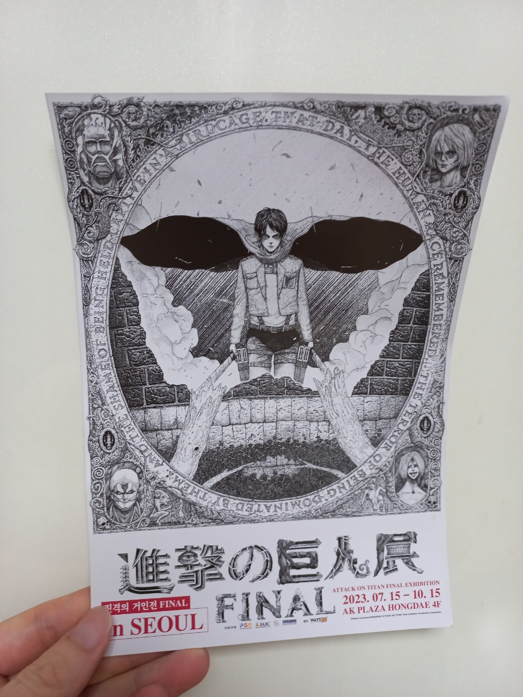 내가 가장 좋아하는 만화 중 하나인 진격의 거인의 전시회가 홍대 AK플라자에서 7/15 ~ 10/15 개최된다고 한다.