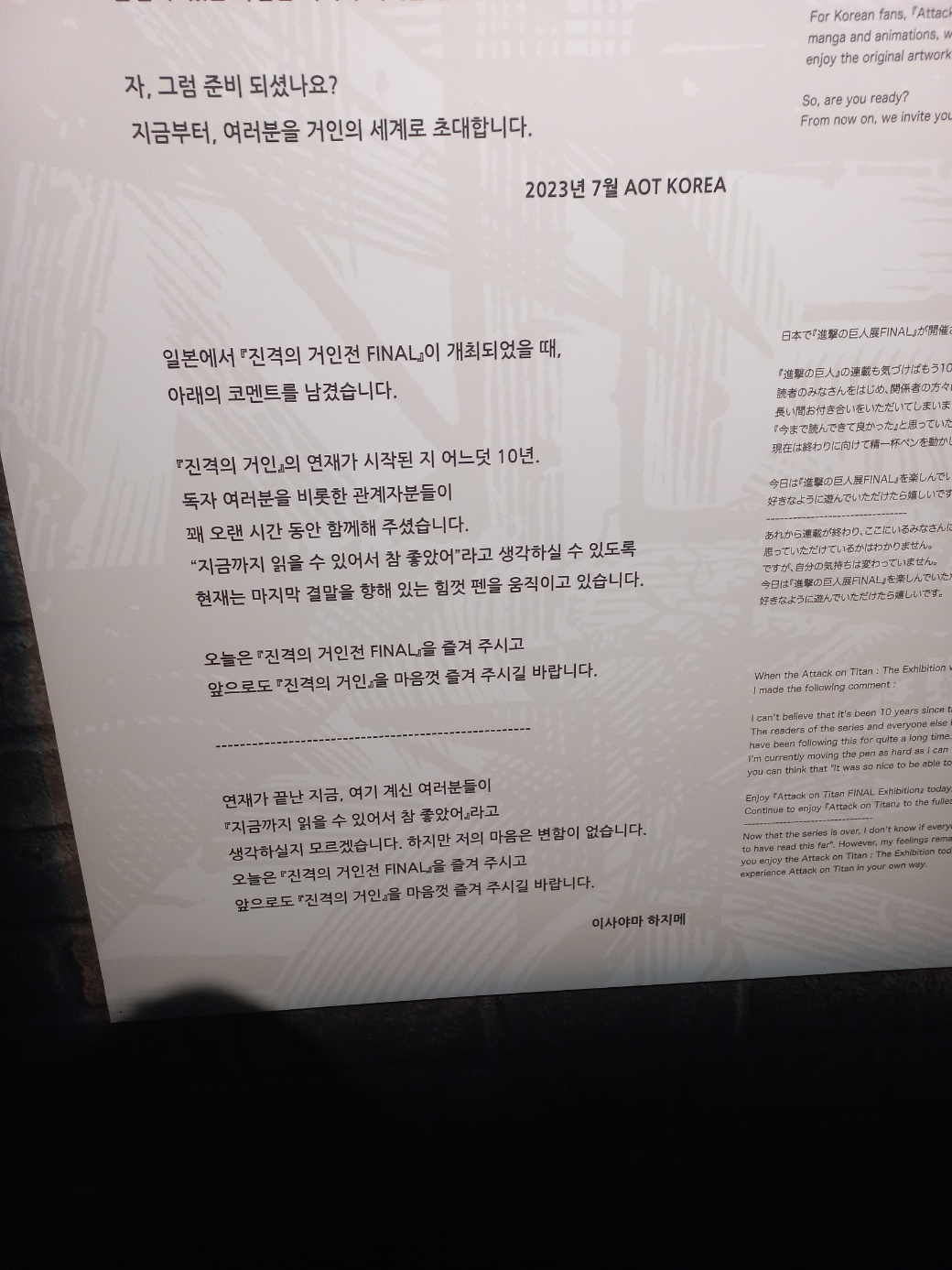 이 전시회는 진격의 거인 FINAL 전시회인데 2019년에 도쿄에서 열렸다가 코로나때문에 쉬다가 올해가 되어서야 우리나라에서 열린거라고 한다. 그리고 2019년 당시에는 진격의 거인 만화책이 아직 완결을 짓지 않은 상황이었기 때문에 위와 같은 인사말을 남긴걸로 보인다. 그나저나 10년 연재라니...