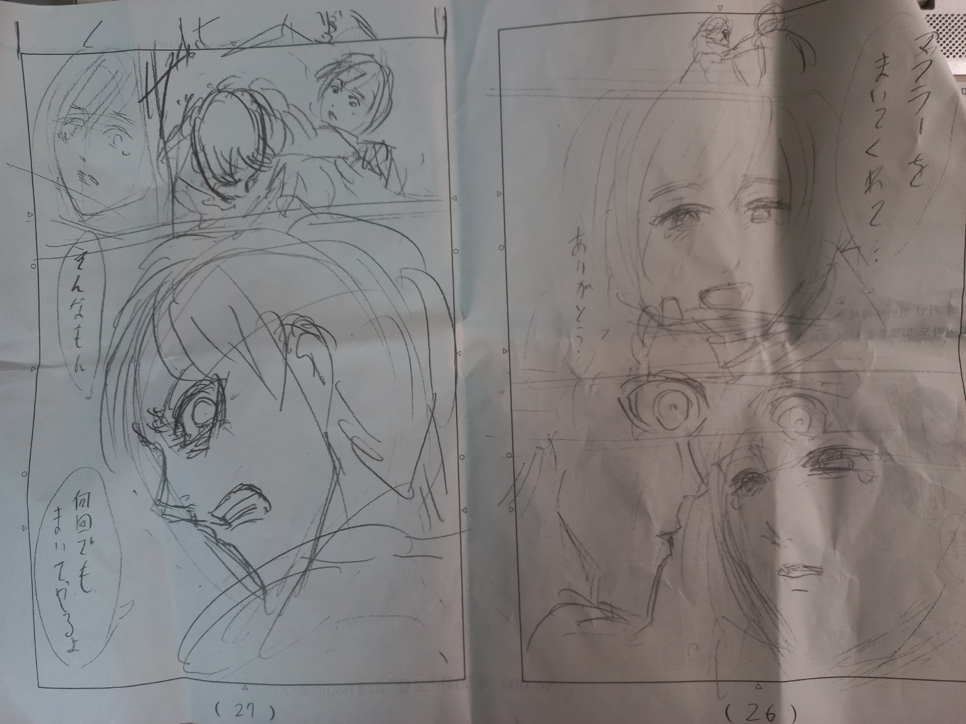 원고를 실제로 보니 정말 신기하다. 위에는 시간시나 구 벽면을 그린게 아닌가 싶다. 조사병단이 출격을 나가는 상황이랄까.