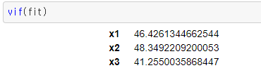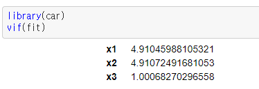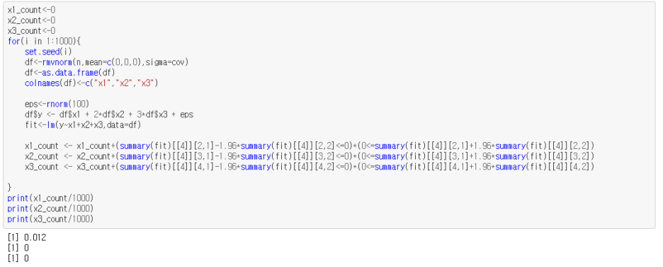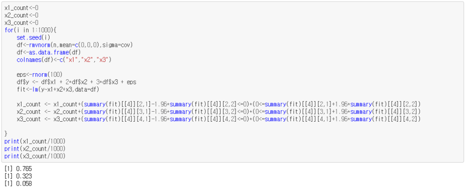 즉, 이 경우에도 X1,X2,X3의 회귀모수에 대한 신뢰구간이 1,2,3을 포함함을 확인할 수 있다. 단, 이 경우에 각 회귀계수에 대한 표준오차는 0.8정도로 전에 다중공선성이 심하지 않았을 때 0.2 정도였던거에 비하면 증폭이 되었다.