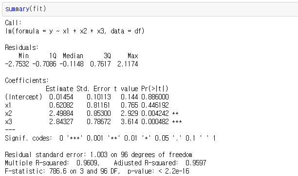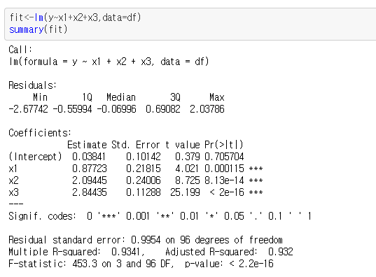 이 경우 , x1,x2,x3의 신뢰구간이 모두 회귀모수 1,2,3을 포함한다. (회귀계수는 정규분포를 따르므로, 회귀모수에 대한 신뢰구간은 (회귀계수 - 1.96 * 표준오차, 회귀계수 + 1.96*표준오차) 와 같이 나타낼 수 있다. )