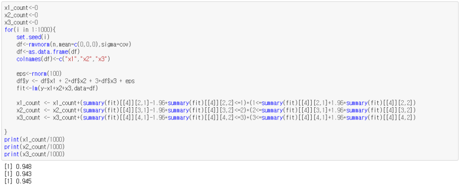 그 결과 각 회귀계수의 신뢰구간이 각 회귀모수를 950번에 가깝게 포함함을 확인하였다.
