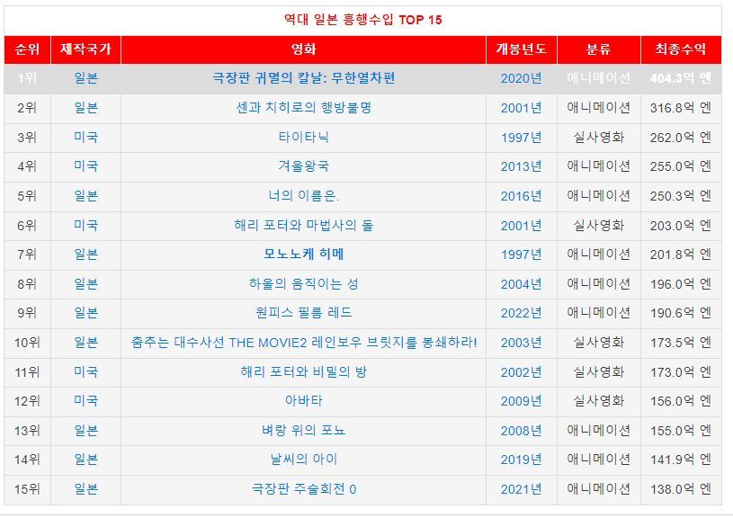 역대 일본 흥행 수입 [출처 나무위키]