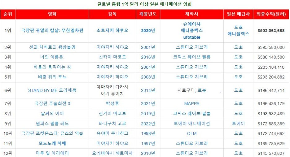 글로벌 흥행 1억 달러 이상 일본 애니 영화 [출처 나무위키]